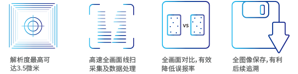 全畫面掃高速數據處理 / 全畫面對比降低誤報率 / 全圖像保存數據可追溯 / 解析度最高可達3.5微米